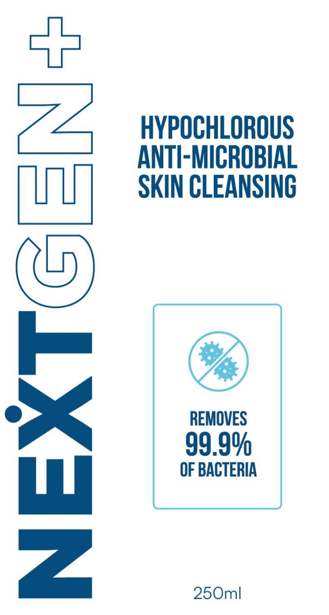 NEXTGEN+ is an anti-microbial hypochlorous solution to effectively remove bacteria of the skin without causing any irritation or stinging and leaving no residue. NEXTGEN+ has been proven to remove 99.9% of Escherichia coli, Staphylococcus aureus and Candida albicans.